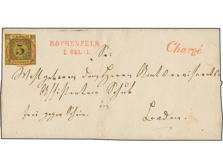 "120" in rot, klar und gerade auf 3 Kr. auf orangegelb, mit klar in rot nebengesetztem L2 "ROTHENFELS 7. Okt. 51" und Schreibschrift-L1 "Chargé" auf recommandirter Briefhülle nach Baden. Ein sehr attraktiver und seltener Brief; mit dem roten Stempel hat PROFI keinen weiteren Chargé-Brief registriert. Fotoattest Stegmüller BPP (2025)