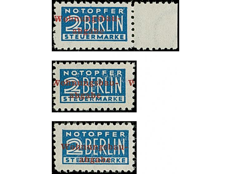2 Pfg. (dunkel)blau gezähnt L 11¾ und mit Wasserzeichen 3X, drei Exemplare mit den Aufdruckfarben rot, dunkelkarminrot und Karminbraun, jeweils postfrisch und bis auf leichtem Gummibug bei der c-Farbe in einwandfreier Erhaltung, zweimal unsigniert mit Fotoattesten P. Harlos BPP (1990 +2006) und einmal signiert Straub BPP mit Fotobefund (2022)