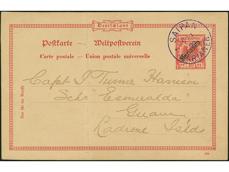 “SAIPAN MARIANEN 9.1.99” (1900), violetter Stempel klar auf Aufdruck-Ganzsachenkarte 10 Pfg. mit englischem Text an eine Kapitän der Esmeralda in Guam. Die Karte mit senkrechter Faltung, ansonsten in guter Erhaltung. Der violette Stempel von Saipan wurde in der Zeit vom 9.-27.1.1900 ohne handschriftliche Änderung der Jahreszahl verwendet und ist auf Bedarfspost außerordentlich selten, Fotoattest R. Steuer BPP (1997)
