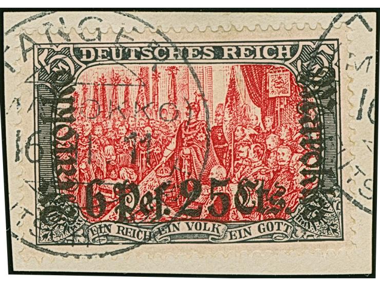 1911, Friedensdruck 6 Pes. 25 cts. auf 5 M. schwarz/dunkelkarmin, sogenannter “Ministerdruck” mit Stempel “TANGER (MAROKKO) 16.11.11” auf Briefstück, in einwandfreier Erhaltung. Ein sehr schönes Exemplar dieser nicht häufigen Marke, sign. Pauligk BPP