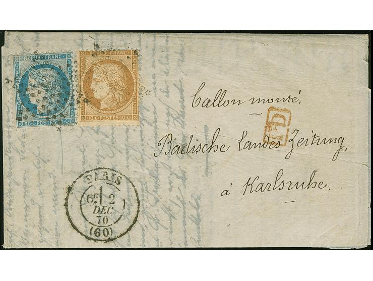 AGENCE HAVAS German edition, Siège 10 c. bistre-brown and 20 c. blue used on entire letter addressed to the "Badische Landes Zeitung" in Karlsruhe, Baden, lightly tied by Paris Star with adjacent "PARIS (60) 2 DEC 70" and red "P.D.", arrival mark of 3.1.71. Very fine. Also letter of the Havas-corespondence after the siege 29.1.1871 to Cairo.