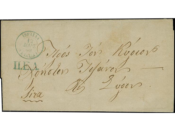 "IBRAILA (BΛAXIA) 12 MAPT.60" clear c.d.s. in blue on entire letter with adjacent "P.E.D." to Syra, taxed on reverse with "100" lepta. Very fine and extremely rare