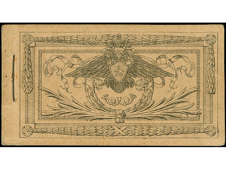 1918 BOOKLET: 1913, Imperial Russia booklet for 2 roubles on black on buff cover, specially issued for the “KIEV POST & TELEGRAPH OFFICE”, originally containing nine panes, each of six adhesives for three values of 7 k. (3), 3 k. (3) and 1 k. (3), overprinted in 1918 with violet trident single rubber handstamp (Bulat Kyiv Type 2), only one pane of 7 k. intact, the others either missing or incomplete, 31 adhesives remaining in total, of no importance for this extremely rare item, unrecorded by Bulat (who mentions only one example of the 80 kopek booklet), fine