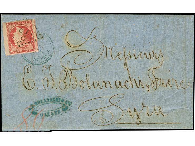 "GALATZ MOLDAVIE .. NOV 61", blue dotted c.d.s. on entire letter to Syros, charged with 80 lepta, paid by 1861, Paris printing, 80 l. rose with good to large margins, tied by no. "67". The very thin stationary paper with some ink corrosion, backed by hinges, otherwise very fine. A rare combination letter.