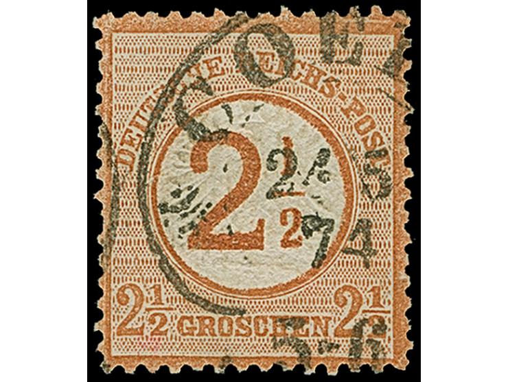 “COELN** 24.5.74” (Spalink 4-2N2) zweimal klar auf zwei losen Marken Ausgabe 1874 2½ auf 2½ Gr. rötlichbraun. Die farbfrischen Marken sind gut geprägt und haben kleine Fehler. Beide Marken stammen vermutlich von der gleichen Fahrpostsendung und sind als “Paar” vermutlich einmalig, eine Marke mit Fotoattest Spalink BPP (1974)