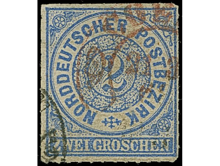 “COELN 21.2.68” (Spalink 4-6N1) in Rot auf loser Marke Norddeutscher Postbezirk 2 Gr. durchstochen. Die leicht eckrunde Marke ist in guter Erhaltung, eine sehr seltene Verwendung mit roter Stempelfarbe, vermutlich in dieser Kombination einmalig, Fotobefund Mehlmann BPP (2018)