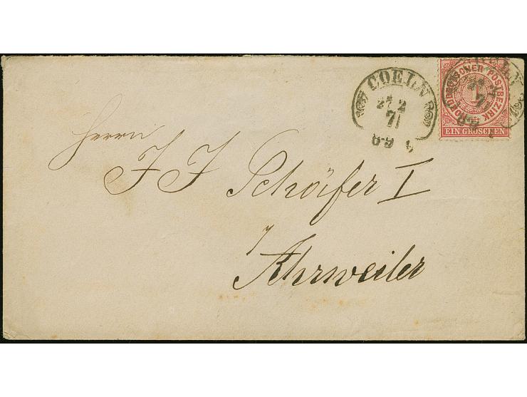“COELN 27.2.71” (Spalink 4-6N2) recht klar auf Norddeutscher Postbezirk 1 Gr. gezähnt auf Briefkuvert nach Ahrweiler mit Ausgabestempel. Der Umschlag mit leichter Patina, die farbfrische und gut gezähnte Marke ist in einwandfreier Erhaltung