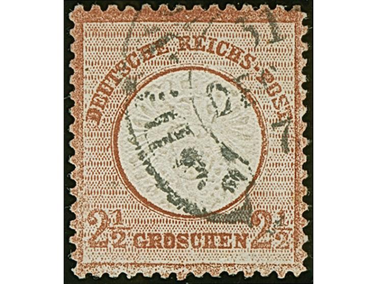 “DÜSSELDORF 31.DECBR.7(2)” (Spalink 11-6) auf loser Marke großer Schild 2½ Gr. mittelrotbraun. Die farbfrische Marke ist deutlich geprägt und zum Teil in der Zähnung korrigiert. Trotz der Einschränkung ein optisch ansprechendes Exemplar mit auf dieser Marke seltener Hufeisenstempel-Entwertung, Fotoattest Sommer BPP (2004)