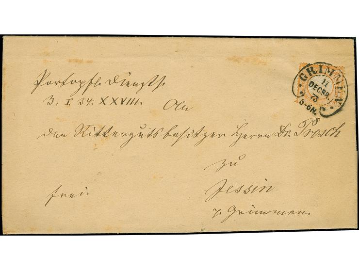 “GRIMMEN 11.DECBR.73” (Spalink 15) sehr klar auf großer Schild ½ Gr. orange auf komplettem Faltbrief nach Jessin in den eigenen Landzustellbereich von Grimmen. Die farbfrische Marke ist gut geprägt, normal gezähnt und leicht getönt, ansonsten in einwandfreier Erhaltung