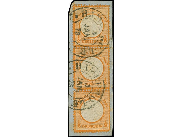 “HAMBURG-L.E. 3.JAN.75” (Spalink 17-12) ohne Zeitgruppenriegel zweimal klar und fast komplett auf Dreierstreifen großer Schild ½ Gr. orange auf Briefstück. Die farbfrischen Marken sind gut geprägt und haben leichte senkrechte Scherentrennung und sind bis auf eine aufgerauten Eckzahn unten in einwandfreier Erhaltung. Ein sehr schönes Briefstück mit diesem seltenen Hufeisenstempel, Fotoattest Sommer BPP (2003)