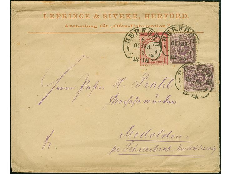 “HERFORD 6.OCTBR.75” (Spalink 18) mehrfach klar auf großer Schild 1 Gr. karmin und zwei Einzelwerte 5 Pfge violett als tarifgerechte Frankatur auf Firmen-Vordruckbrief der 2. Gewichtsstufe nach Medolden bei Scherrebeck mit Ausgabestempel. Die Brustschildmarke ist erkennbar geprägt und hat einen fehlenden Zahn unten, die beiden 5 Pfge-Marken sind farbfrisch und in einwandfreier Erhaltung. Der Umschlag mit Beförderungs- und Randspuren. Eine interessante Mischfrankatur mit ungewöhnlicher Marken-Kombination