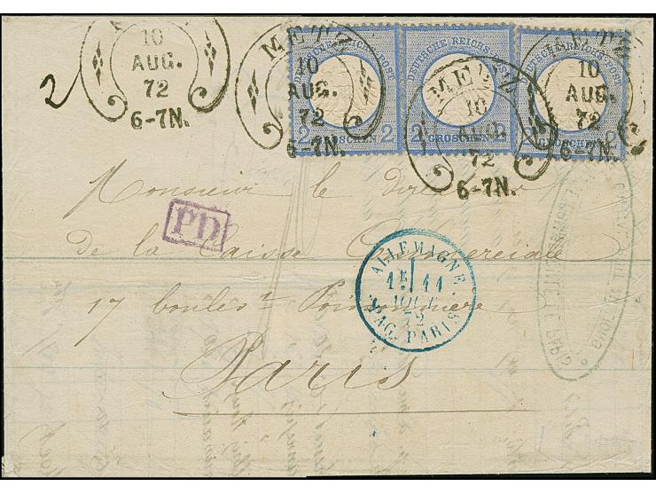 “METZ 10.AUG.72” (Spalink 25-1) mehrfach klar auf drei Einzelmarken kleiner Schild 2 Gr. grauultramarin als tarifgerechte Mehrfachfrankatur auf komplettem Faltbrief mit violettem Ra1 “PD” und frz. Transitstempel nach Paris. Die farbfrischen Marken sind gut geprägt, gut gezähnt und wie der Faltbrief in einwandfreier Erhaltung. Eine dekorative Mehrfachfrankatur mit früher Verwendung des besseren Hufeisenstempels, Fotoattest Krug BPP (2020)