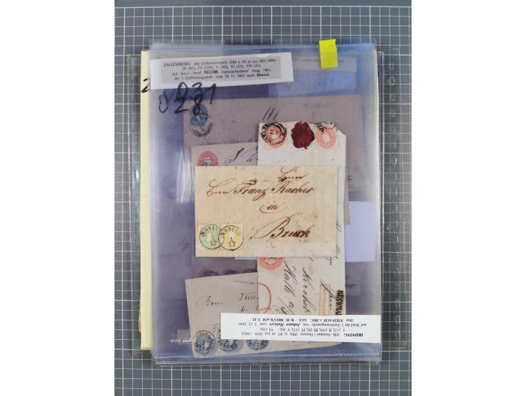 1858/64, interessante Partie mit 37 Briefen, viele bessere Frankaturen, Stempel, Auslandsbriefe und Drucksache, Farb- und Mischfrankaturen, dabei Mi.-Nr. 6I Blau Merkur auf Streifband mit kompletter Zeitung, Wappensaugabe 5 Kr. auf komplettem “Nachfrageschreiben”, etc., unterschiedliche Erhaltung, einige signiert, ein empfohlenes Objekt (ex Mi.-Nr. 6-34)
