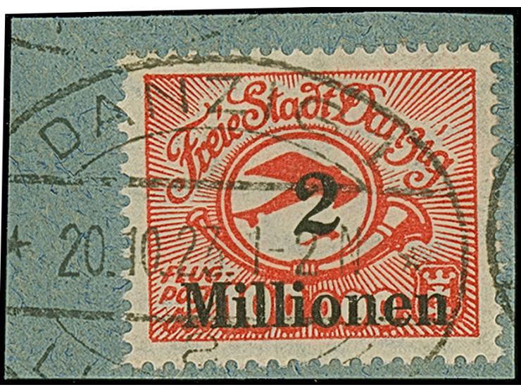 1923, Flugpost 250000 M. bis 5 Mio. auf 50000 M. kpl. je mit zeitgerechter Entwertung “DANZIG LUFTPOST a 20.10.23” auf vier Briefstücken, in einwandfreier Erhaltung. Ein sehr schöner Satz, sign. Kniep und Fotoattest Gruber BPP (2025)