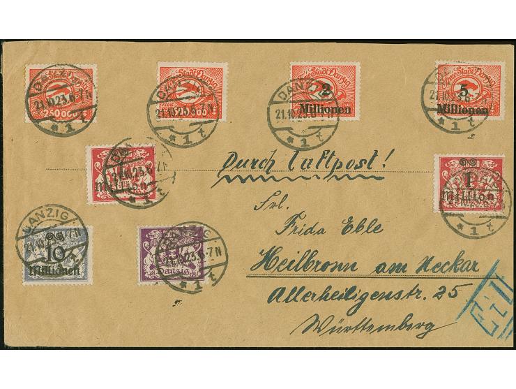 Flugpost 250000 M. - 5 Mio. auf 50.000 M. komplett je mit Stempel “DANZIG *1t 21.10.23” mit Zufrankatur auf überfrankiertem Luftpost-Brief nach Heilbronn. Die farbfrischen Marken mit zeitgerechter Entwertung sind in einwandfreier Erhaltung, der Umschlag ist zweiseitig beschnitten, ansonsten in guter Erhaltung, Fotoattest Gruber BPP (2025)