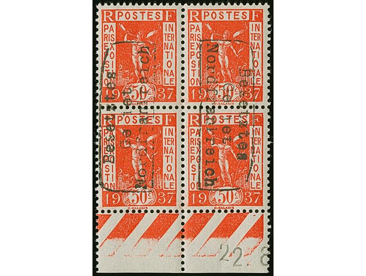 1940, Expo 1937 50C. im senkrechten Unterrandviererblock, dabei der Aufdruck jeweils senkrecht über zwei Marken als Kehrdruck verlaufend, bei dem linken Paar von unten nach oben, bei dem rechten Paar von oben nach unten, im Unterrand Teil des Druckdatums, postfrisch, tadellos, in dieser Form hat ProFi kein weiteres Stück registriert, sign. Calves sowie Fotoattest Krischke (1984)