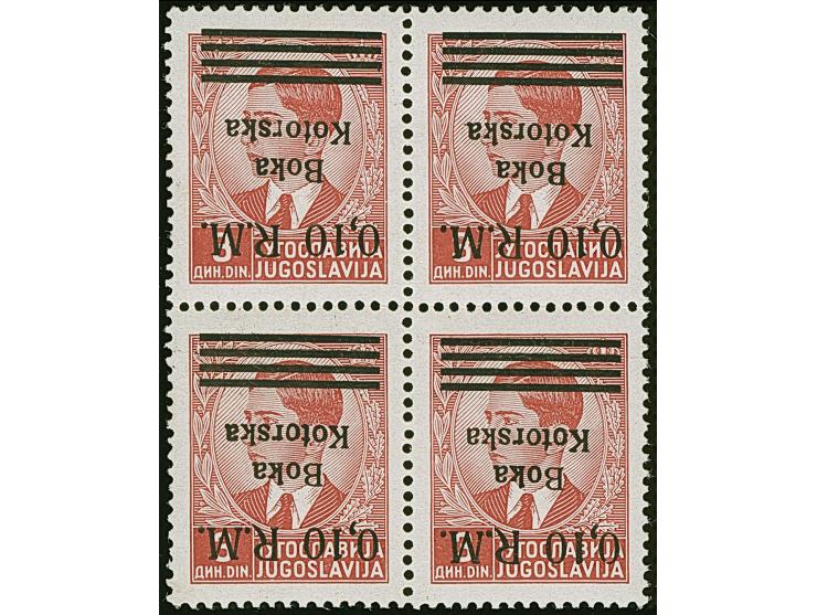 1944, 0,10 M. mit kopfstehendem Aufdruck, Viererblock von den Aufdruckfeldern 19-20 sowie 29-30, postfrisch, tadellos, teils etwas vorgefaltet, selten, sign. sowie Fotoattest Brunel (2025)