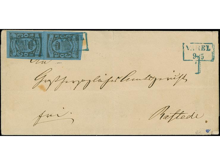 1 Gr. auf lebhaftgraublau, zwei Einzelmarken als Paar geklebt mit blauem Rahmenstempel “VAREL 9.5.” als tarifgerechte Mehrfachfrankatur auf Faltbriefhülle der 2. Gewichtsstufe nach Rastede mit Ankunftsstempel. Die farbfrischen Marken sind allseits voll- bis breitrandig, die linke Marke mit kleinem Vortrennschnitt außerhalb des Markenbildes und die Briefhülle mit Faltspuren. Ansonsten ist die Marke und die Briefhülle in einwandfreier Erhaltung. Eine ganz ungewöhnliche Mehrfachfrankatur mit zwei Einzelmarken, signiert R. Friedl Wien und Fotoattest Brettl A.I.E.P. (2011)