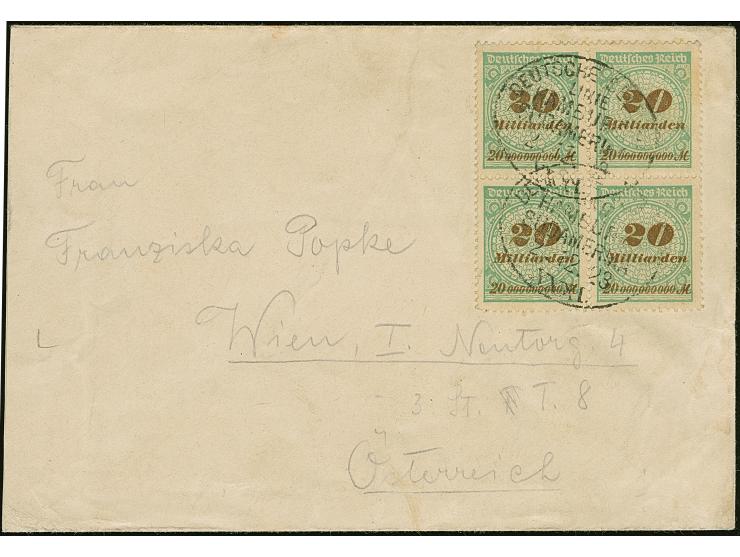 Korbdeckel 20 Mrd. M. gezähnt im Viererblock mit Schiffspost-Stempel “DSP LINIE HAMBURG-SÜDAMERIKA XXXI 2.12.23” auf Brief im Wechselverkehr nach Wien. Noch zum alten November-Tarif tarifgerecht freigemacht. Eine seltene Verwendung im Dezember 1923, der Umschlag mit Beförderungsspuren und Patina