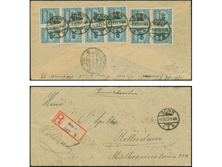 Korbdeckel 50 Mrd. M. gezähnt im Viererblock und senkrechtem 8er-Block je mit Stempel “BONN 1.12.23” als tarifgerechte Mehrfachfrankatur rückseitig auf R-Brief bis 20 g nach Rotterdam mit Ankunftsstempel. Der Umschlag mit Öffnungsfehler rückseitig, wenige Marken mit winzigen Zahnfehlern und die rechte untere Marke vom Viererblock mit kleinem Einriss, ansonsten in guter Erhaltung. Eine nicht häufige Mehrfachfrankatur dieser Marke mit 12 Werten vom Ersttag der Portoperiode, sign. Infla Berlin