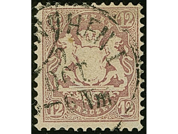 1870/75, 12 Kr. braunpurpur mit Wasserzeichen 1Y (weite Rauten), farbfrisch und allseits vollrandig gezähnt mit klarem EKr. “(MÜ)NCHEN I 9.OCT.” entwertet, in tadelloser Erhaltung. Einwandfreie Exemplare dieser Marke mit klaren Entwertungen sind außerordentlich selten, sign. Pfenninger, Thier und Fotoattest Sem BPP (2004)