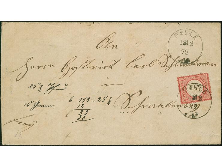 1 Gr. karmin mit Plattenfehler “gebrochenes S in DEUTSCHE” (Feld 4) mit EKr. “POLLE 18.2.72” auf kpl. Faltbrief. Die farbfrische Marke ist sehr gut geprägt, gut gezähnt und in einwandfreier Erhaltung, Fotoattest Sommer BPP (2003)