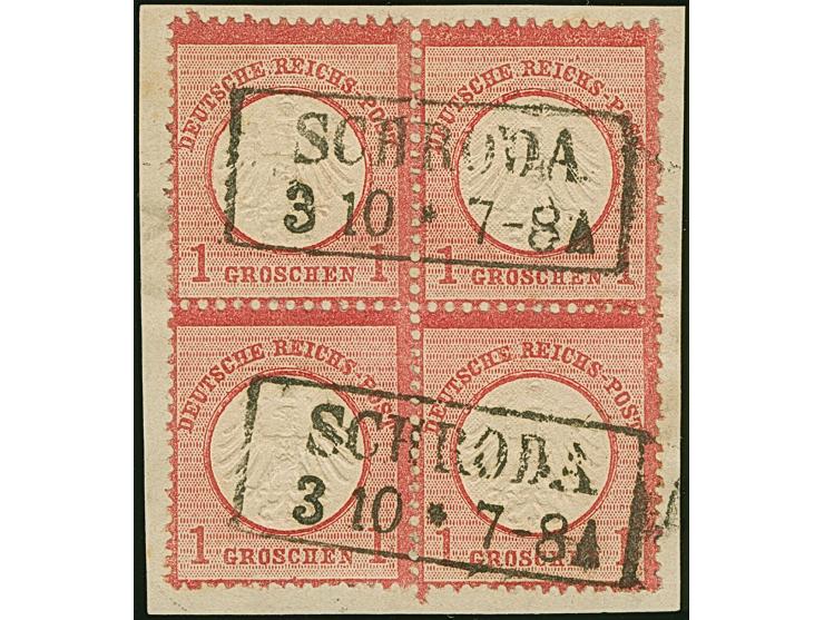 1 Gr. karmin mit Plattenfehler “Akzent über C in REICHS auf der 1. Strichleiste” (Feld 10) im Viererblock mit drei Normalmarken, sehr klar mit zwei Rahmenstempel “SCHRODA 3.10.” entwertet. Die farbfrischen Marken sind gut geprägt und bis auf einen kurzen Zahn üblich gezähnt und in einwandfreier Erhaltung, Fotobefund Krug BPP (2009)
