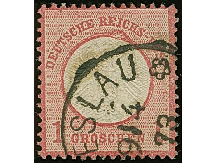 1 Gr. karmin im kleinen Format L15 mit Plattenfehler “Beule am Kreis unter REICHS” (Feld 150) und Prägefehler rechts unten am Schild, sauber mit EKr. “BRESLAU 9.4.73” entwertet. Die farbfrische Marke ist sehr gut geprägt, gut gezähnt und in einwandfreier Erhaltung, Fotoattest Sommer BPP (2005)