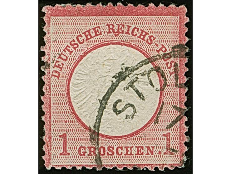 1 Gr. karmin mit Plattenfehler “tropfenförmiger Punkt hinter Groschen”, sauber gestempelt, die farbfrische Marke ist erkennbar geprägt, üblich gezähnt und in einwandfreier Erhaltung, Fotoattest Hennies BPP (1976)