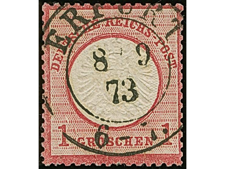 1 Gr. karmin mit Plattenfehler “Plattenbruch zwischen O und S in GROSCHEN bis zum R in Reichs”, klar mit zentrisch aufgesetztem DKr. “ERFURT 8.9.73" entwertet. Die farbfrische Marke ist sehr gut geprägt und bis auf Zähnungsunebenheiten in einwandfreier Erhaltung. Ein dekoratives Exemplar mit diesem markanten Plattenfehler, Fotoattest Brugger BPP (2010)