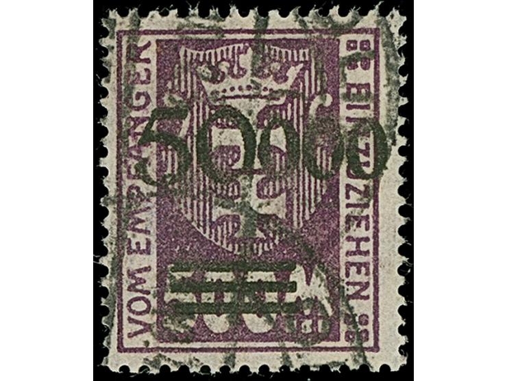 50.000 auf 500 M., Aufdruck rußig, sauber gestempelt "OLIVA 3.10.23.". Einwandfrei. Signiert Infla und Fotoattest Gruber BPP (2025)