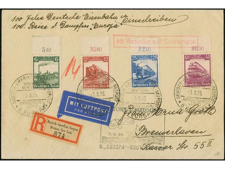 “DASP BREMEN-NEW YORK D. EUROPA” mehrfach klar auf Oberrandsatz 100 Jahre Deutsche Eisenbahn 6-40 Pfg. auf R-Katapultpost-Brief mit Sonder-Cachet “D. Europa-Sputhhampton 7.8.35” und R-Zettel “Deutsch-Amerikan. Seepost Bremen-New York” nach Bremerhaven mit Ankunftsstempel, in guter Erhaltung (Graue K232c)