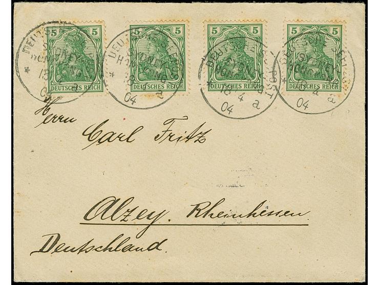 “DSP SYDNEY-HONGKONG *a 18.,4.04” (D. Medan), viermla klar auf vier Einzelmarken Germania 5 Pfg. als tarifgerechte Mehrfachfrankatur auf Brief nach Alzey mit Ankunftsstempel. Die Marken zum Teil mit Gelbflecken, ansonsten in guter Erhaltung. Ein seltener Schiffspoststempel aus der Südsee