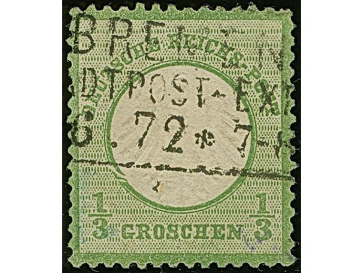 ⅓ Gr. gelblichgrün mit Plattenfehler “Kreisbruch links in Höhe der 11. Strichleiste” (Feld 141), klar mit Rahmenstempel “BREMEN STADTPOST-EXP…6.72” entwertet. Die farbfrische Marke ist erkennbar geprägt und bis auf zwei verkürzte Zähne üblich gezähnt und ansonsten in einwandfreier Erhaltung, u.a. sign. Sommer BPP und Fotoattest Krug BPP (2007)