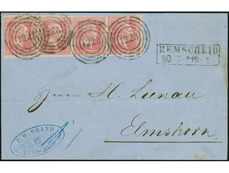 1 Sgr. rosa im waagerechten Vierer-Streifen, links noch voll-, sonst voll- bis breitrandig, rechts mit Teil der Nachbarmarke, mit Nr. "1228" und sauber nebengesetztem Ra2 "REMSCHEID 30 7" auf Briefhülle nach Elmshorn im dänischen Herzogtum Holstein. 1 Sgr. Weiterfranko vorderseitig vermerkt. Eine attraktive und seltene Streifen-Frankatur.