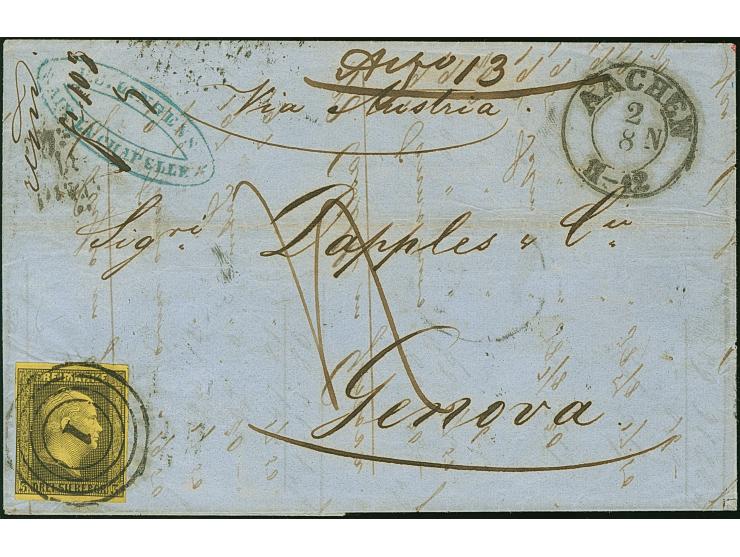 3 Sgr. auf gelb, unten links an die Randlinie geschnitten, sonst voll- bis breitrandig, mit klar aufgesetzter Nr. "1" und sauber nebengesetztem DKr. "AACHEN 2 8" (1853) auf komplettem Faltbrief über Österreich nach Genua, Königreich Sardinien. Die Frankatur bezahlte das Postvereinsporto, das sardische Porto vorderseitig taxiert und vom Empfänger eingezogen. Ein interessanter und seltener Auslandsbrief.