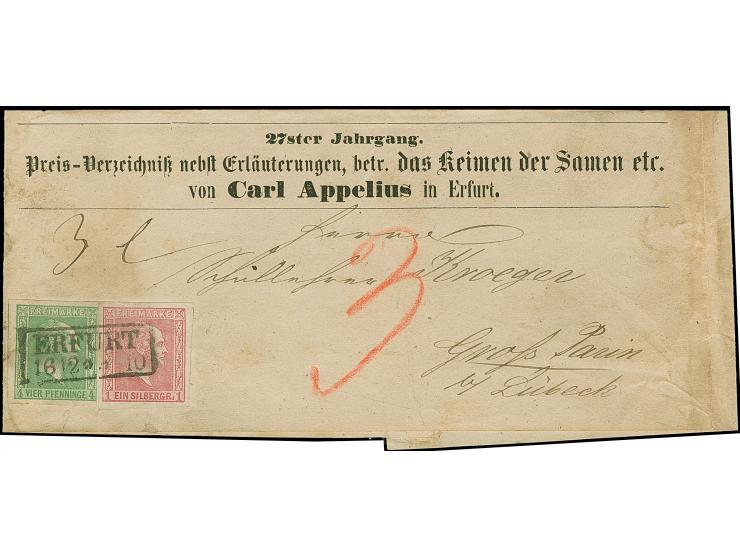 4 Pfge. grün und 1 Sgr. rosa, erstere rechts berührt, sonst beide breitrandig, mit Ra2 "ERFURT 16 12" auf vorgedruckter Zeitungsschleife der 4. Gewichtsstufe nach "Groß Parin b. Lübeck". Tatsächlich war Groß Parin Bestandteil des Fürstentums Lübeck, welches unter dänischer Posthoheit stand; entsprechend rückseitig durch Langstempel des Stadt- und dänischen Postamtes von Lübeck. Ungewöhnlicherweise wurde hier das Teilfranko in Lübeck akzeptiert und lediglich der dänische Anteil von 4mal ½ Silbergroschen, umgerechnet in "3" Lübsche Schillinge nachtaxiert. Ganz gering fleckig und die 4Pfg. kleine Aufklebefalte. Eine hochinteressante und in dieser Form wohl einmalige Auslandsdrucksache.