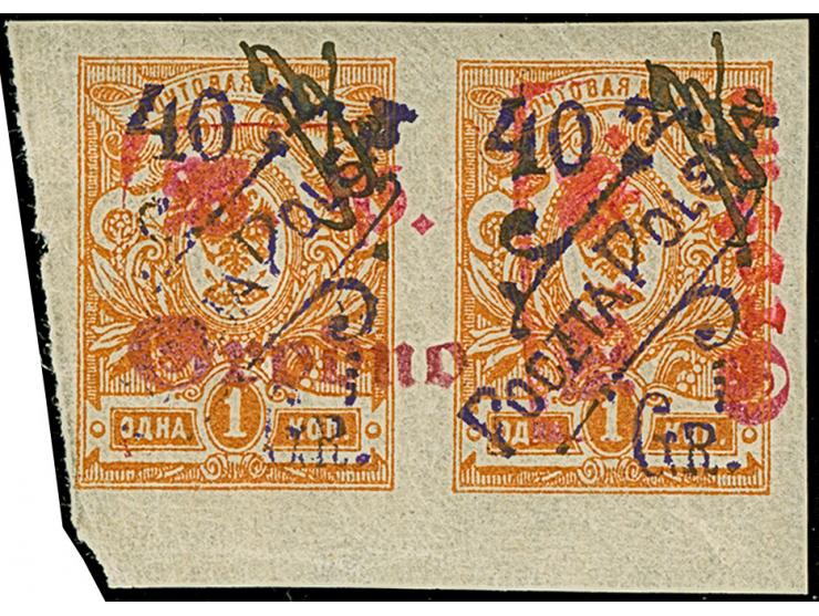 1919, 40 Gr. auf 1 Kop. orange, waagerechtes Paar, dabei der deutsche Aufdruck auf der linken Marke normal waagerecht, auf der rechten senkrecht stehend, sauber mit Manuskript “B” (=Bauer) entwertet, tadellos, eine sehr seltene und attraktive Einheit, Fotoattest Mikulski (1991)