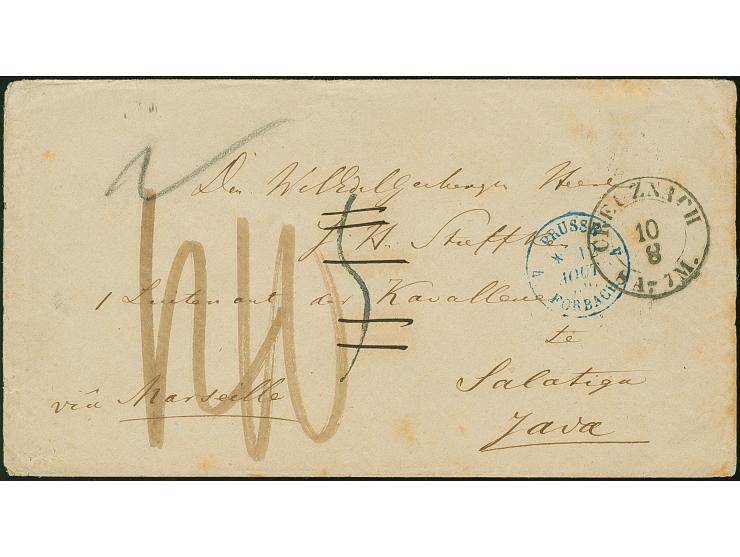 1859, zweiseitig geöffnetes unbezahltes Briefkuvert von "CREUZNACH 10.8." via Marseille nach Salatiga, Java, mit Ankunftsstempel. Minimal fleckig. Seltene Destination.