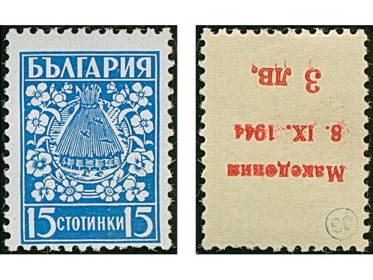 3 L. auf 15 St. mit kopfstehendem Aufdruck in Type II auf der Gummi-Seite, postfrisch mit wenigen verkürzten Zähnen unten, ansonsten in einwandfreier Erhaltung. Eine außerordentlich seltene Aufdruck-Abart, bisher ist kein weiteres Exemplar bekannt, violette Signatur und Fotoattest Dr. El Majdoub BPP (2025)