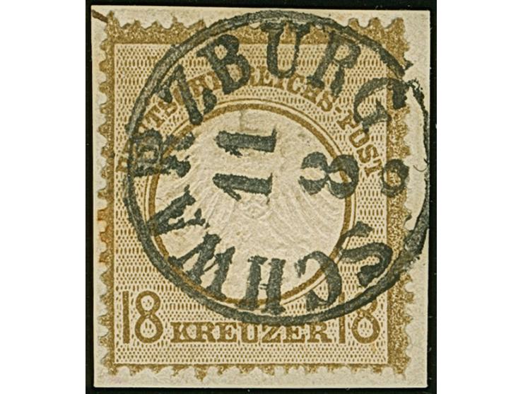 18 Kr. ockerbraun, farbfrisch in dunklerer Nuance mit sehr klarem Taxis-EKr. “SCHWARZBURG 11.8.” auf Briefstück, Die Marke ist deutlich geprägt, üblich gezähnt und in tadelloser Erhaltung. Ein außerordentlich schön gestempeltes Exemplar mit auf dieser hohen Wertstufe seltener Entwertung. ProFi hat nur drei weitere Einzelmarken und einen Viererblock der 18 Kreuzer-Wertstufe mit diesem Stempel registriert, sign. TS und FA.RF. Engel sowie Fotoattest Krug BPP (2011