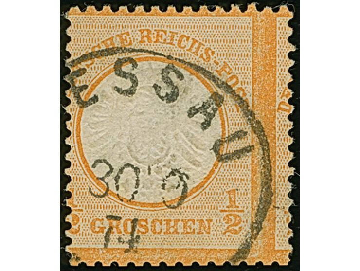 ½ Gr. orange mit stark nach rechts verschobener, senkrechter Zähnung und klarem EKr. “(D)ESSAU 30.9.74”. Die farbfrische Marke ist gut geprägt, gut gezähnt und in einwandfreier Erhaltung. Bei dieser Wertstufe kommen so starke Verzähnung selten vor, Fotobefund Sommer BPP (2005)