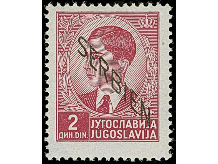 1941, 2 Dinar lilakarmin, mit Aufdruck “SERBIEN” und der Netzunterdruck nur im Blinddruck, postfrisch, tadellos. Eine erstaunlich seltene Marke, sign. SG (winzig durchschlagend) sowie Befund Brunel BPP (2007)