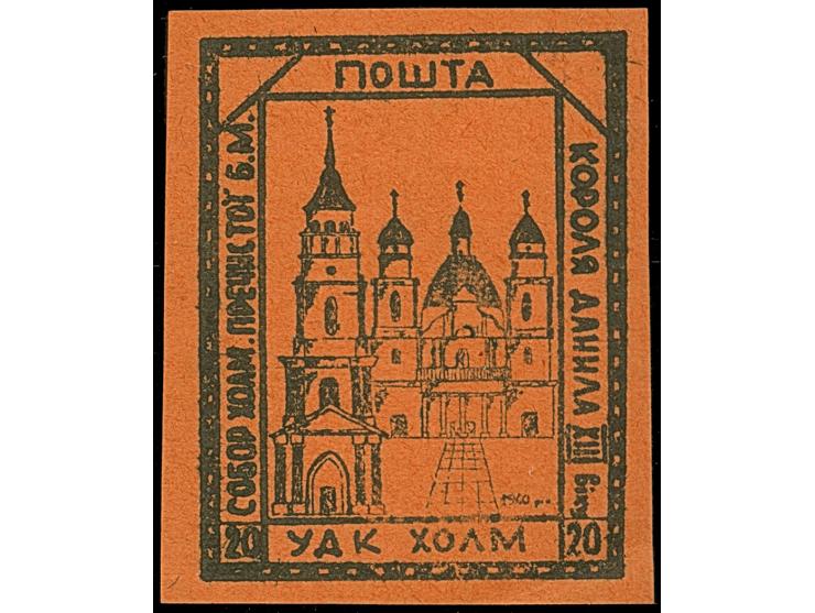 1. AUSGABE: Kirchen 12 Gr. violett, zwei Werte 15 Gr. rot auf rosa mit Aufdruck “19.IX.1941 KIEV” sowie 20 Gr. schwarz auf rot, tadellos (Maksymczuk #3-4)