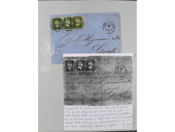 1850/67 (ca.), 37 Briefe und Ganzsachen sowie zwei Vorderseiten, fast ausschließlich Auslands-Frankaturen nach Belgien, Dänemark, Frankreich, Großbritannien, Italien, die Niederlande, Russland, Schweden, die Schweiz und die USA, dabei seltene Frankaturen und einige Drucksachen.