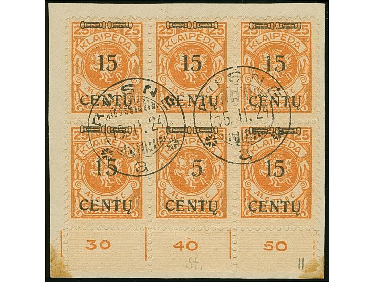 1923, Neue Währungsaufdrucke 15 Centu auf 25 Mark., Unterrand-Sechserblock von den Druckfeldern 83-85 und 93-95, die mittlere untere Marke mit Aufdruckfehler “5 statt 15”, sauber mit Stempel “RUSNE 15.II.24” auf Briefstück, in den Ecken des Briefstück etwas fleckig, sonst tadellos, sign. Dr. Petersen BPP