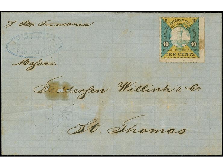 1875, 10C. schwarz/blaugrün/gelb, rechts ungezähnt, sauber mit blauem Ankerstempel auf Faltbriefhülle mit nebengesetztem Absenderstempel “P.G. BUHROW & CO CAP HAITHIEN” und Leitvermerk “p. Str. Franconia” nach St. Thomas mit Ankunftsstempel, geringe Alters- und Beförderungsspuren, kleiner Tesafleck in der Anschrift, unmerklicher senkrechter Bug, ein insgesamt attraktiver und seltener Brief