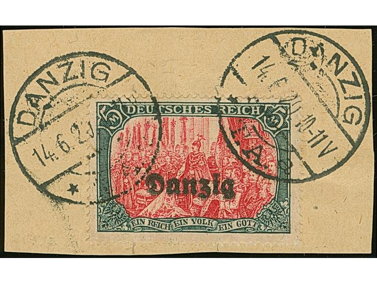 1920, 5 Mark grünschwarz/lilarot, Zähnungslöcher 25:17, mit doppeltem Aufdruck, sauber mit zeitgerechter Entwertung “DANZIG * T.A. 14.6.20” auf Briefstück, links kleine Kerbe, sonst in tadelloser Erhaltung, eine sehr seltene Marke, sign. Infla Berlin und Kniep BPP mit Fotoattest (1987)