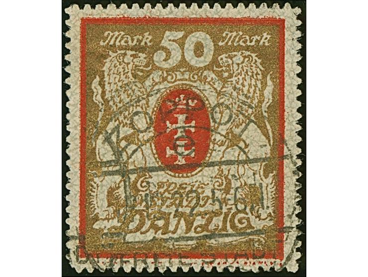 1922, Großes Staatswappen 50 Mark rot/gold mit stehendem Wasserzeichen, farbfrisch und gut durchstochen, sauber und klar, zeitgerecht gestempelt “ZOPPOT 17.12.22 5-6N.”, tadellos, Fotoattest Gruber BPP (2013)