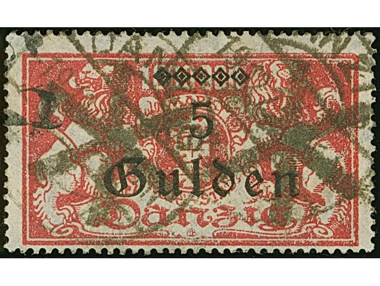 1923 Großes Wappen 5 Gulden auf 1 Mio. Mark, farbfrisch und gut gezähnt, sauber zeitgerecht gestempelt “DANZIG 19.12.23” mit zusätzlichem Sicherungsstempel, tadellos, eins schönes Stück, Fotoattest Bock BPP (2020)